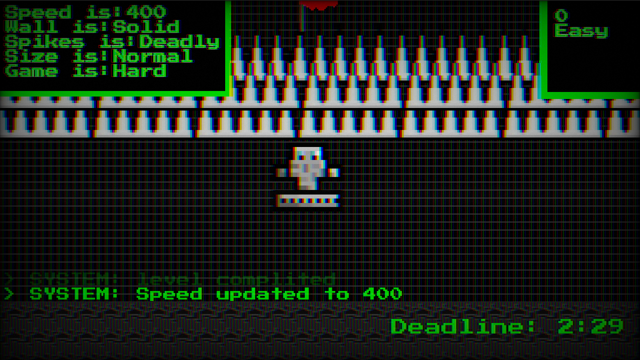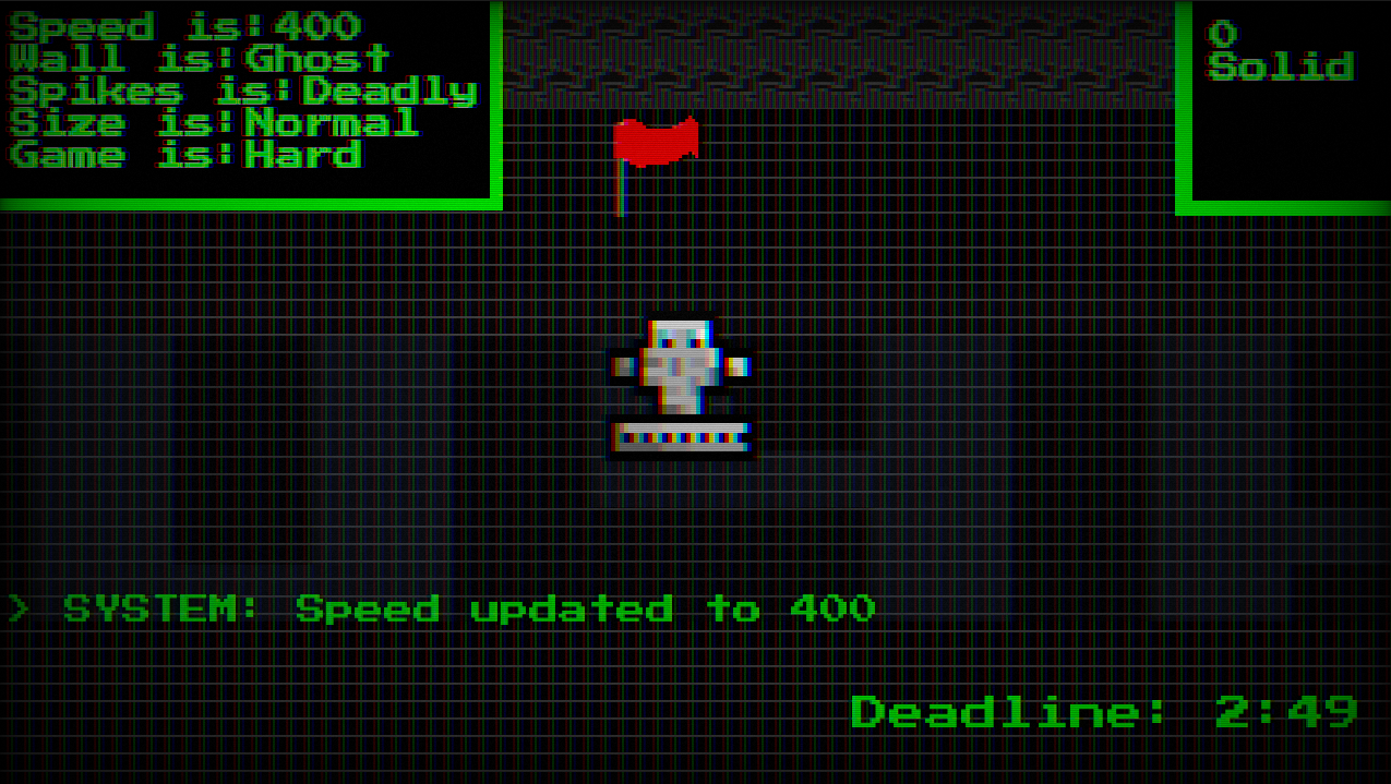 The world around you is defined by a set of active rules. Too slow to dodge? Walls blocking your path? Spikes in the way? Open the system and change the values.